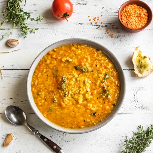 Dissolve stock cubes in boiling water. Add lentils, coconut milk and vegetable stock and simmer with lid on for 30-40 minutes.